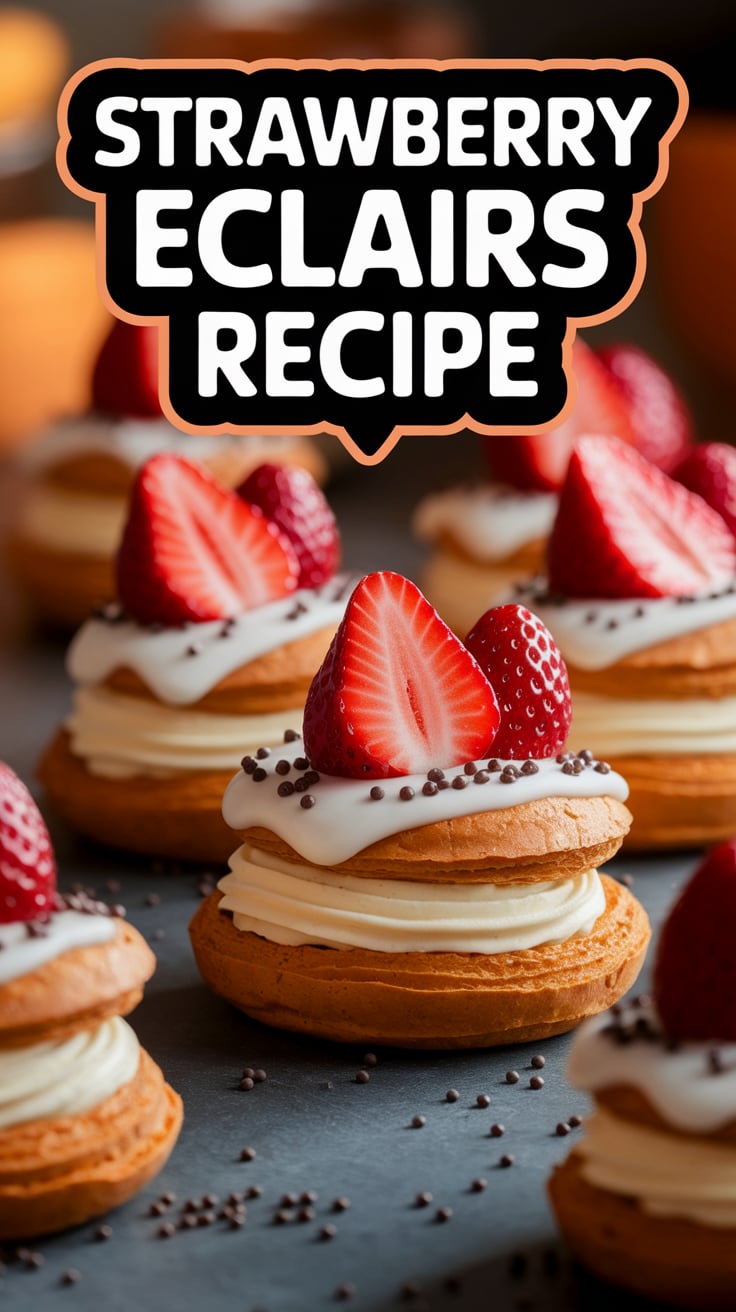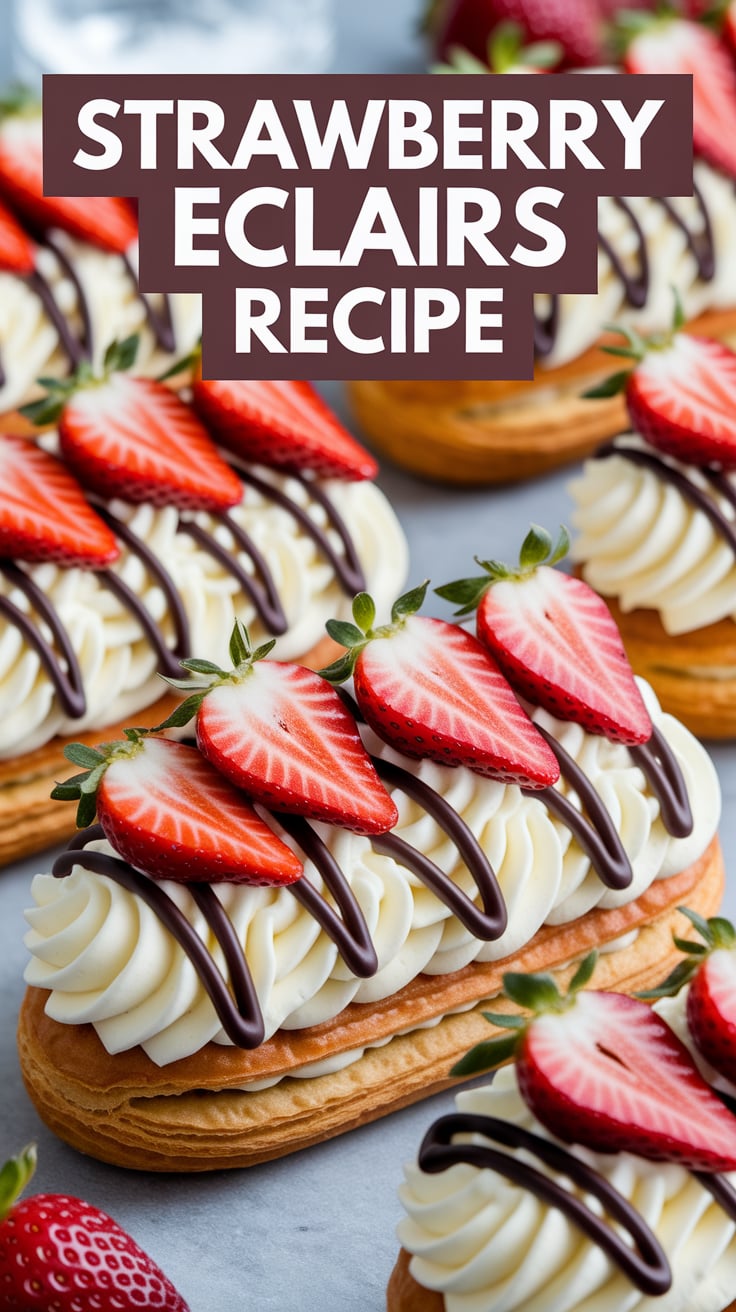 - Use vertical images (1000×1500 px) with text overlays like: “Easy Strawberry Éclairs Recipe – Light, Creamy & Perfectly Sweet!”